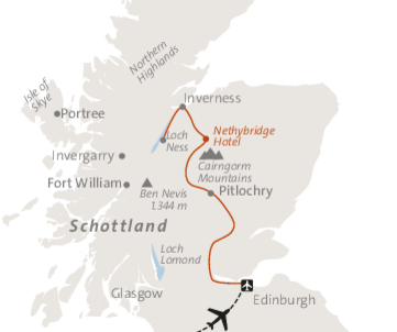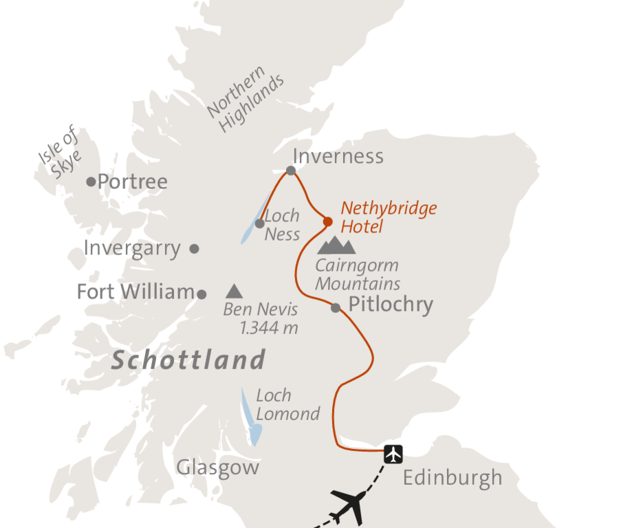 Nach der Ankunft erfolgt ein ca. 3-stündiger Transfer bis nach Nethy Bridge. Am ersten Abend treffen wir unseren Wanderführer an der Rezeption des Hotels und lernen uns bei einem gemeinsamen Abendessen kennen.