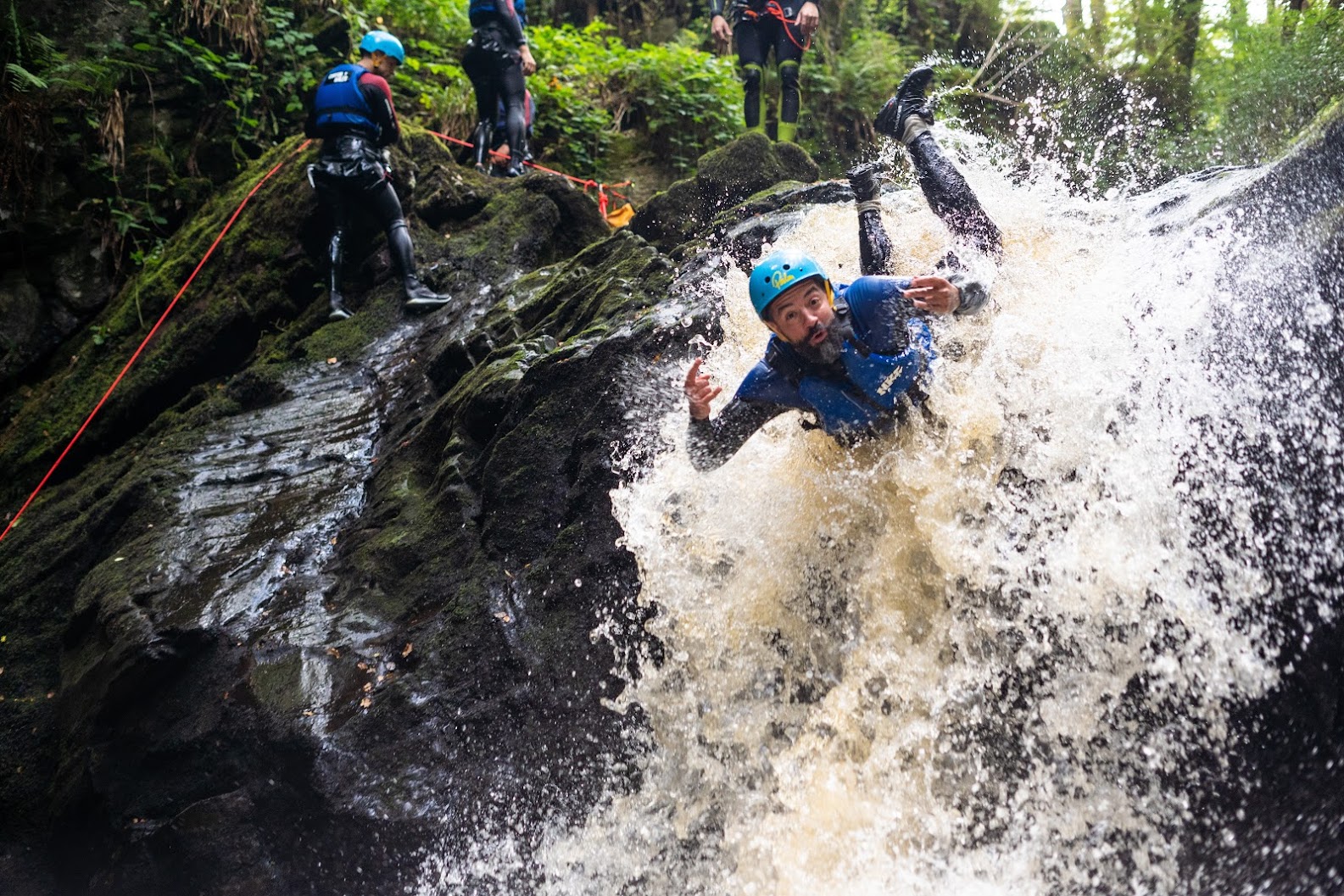 <Auf geht's zum Canyoning! Wir werden einen kurzen Transfer zu einer wunderschönen Flussschlucht machen. Klettern, kraxeln, springen und spritzen Sie sich Ihren Weg durch das herausfordernde Terrain. Dieses unterhaltsame, aber körperlich anspruchsvolle Erlebnis ist ein großartiger Tagesausflug in einem atemberaubenden Teil von Nordwales. Genießen Sie die Aussicht, während Sie sich gemeinsam an Wasserfällen abseilen und von Felsen in den Fluss springen! Genießen Sie einen freien Abend in Betws-y-Coed, um sich von der körperlichen Anstrengung des Canyoning zu erholen.