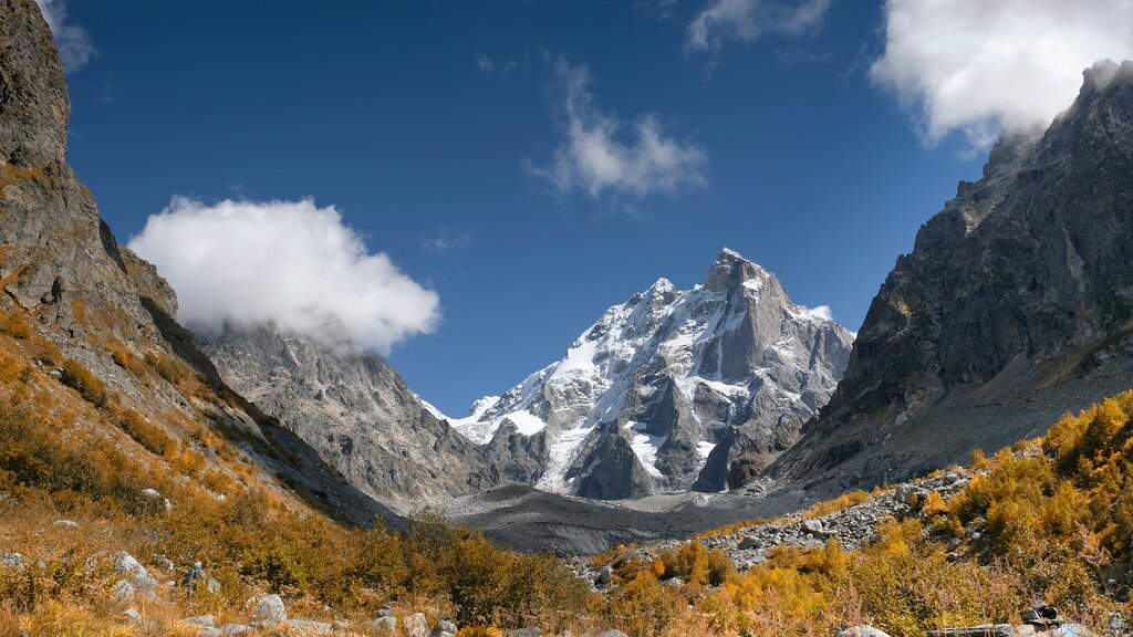 <Am Morgen fahren wir durch das Snotal bis zum abgelegenen Dorf Dschuta, das 6-7 Monate im Jahr von der Außenwelt abgeschnitten ist. Unsere Wanderung führt uns durch ein stilles Gebirgstal mit beeindruckendem Blick auf den Berg Tschauchebi (2.550 m) – die Landschaft erinnert an die Dolomiten. Nach der Rückkehr nach Dschuta fahren wir weiter nach Gudauri zu unserer nächsten Unterkunft.