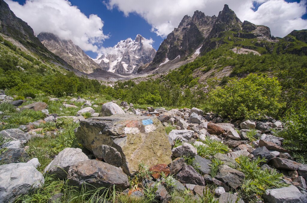 <Heute erwartet uns unser erster Tag auf dem Transcaucasian Trail – eine echte Herausforderung, aber wohl auch die schönste Etappe unserer Reise. Wir starten in Betscho und nähern uns Schritt für Schritt dem eindrucksvollen Uschba und seinen Gletscherzungen.
