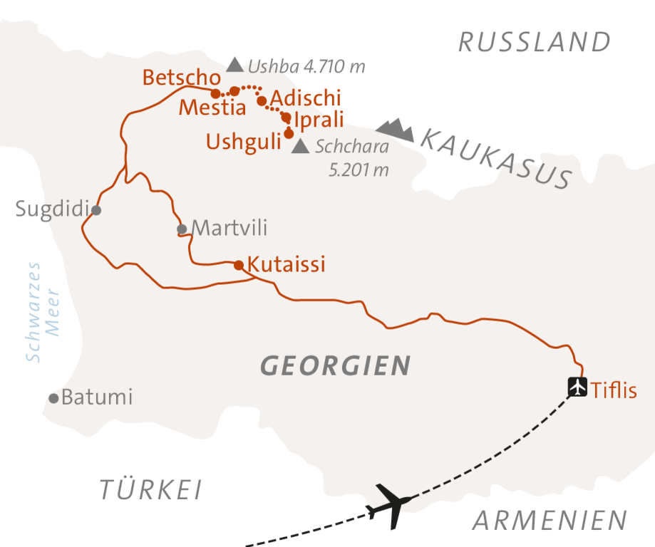 <Langsam nähern wir uns Swanetien. Am Morgen fahren wir mit dem Zug von Tiflis bis nach Zugdidi und setzen unsere Reise dann weiter in die Bergregionen im Nordwesten Georgiens fort. Swanetien begrüßt uns mit seinen höchsten Bergen, beeindruckenden Gletschern und außergewöhnlichen Traditionen.