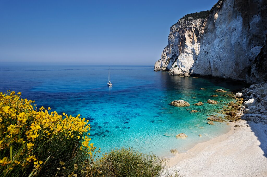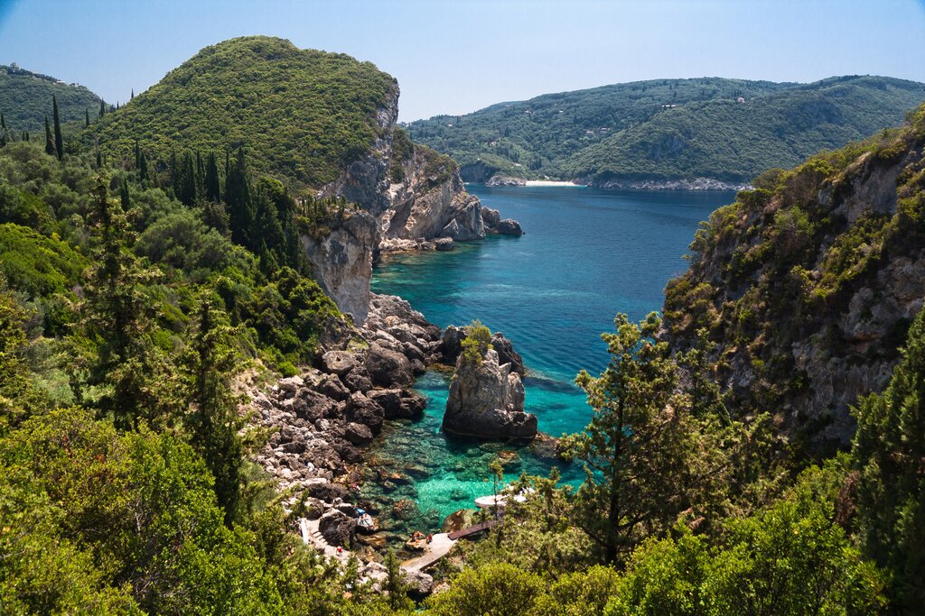 <Ein kurzer Transfer bringt uns nach Paleokastritsa, wo wir das Kloster mit seinem herrlichen Blick auf das Meer besuchen. Von hier starten wir unsere Wanderung über Lakones nach Vistonas und Makarades. Der Weg führt durch Olivenhaine und vorbei an kleinen Dörfern, während sich immer wieder atemberaubende Ausblicke auf die Steilküste öffnen. Auf einem alten Maultierpfad steigen wir hinab zur Bucht von Agios Georgios – eine der schönsten der ganzen Insel.
