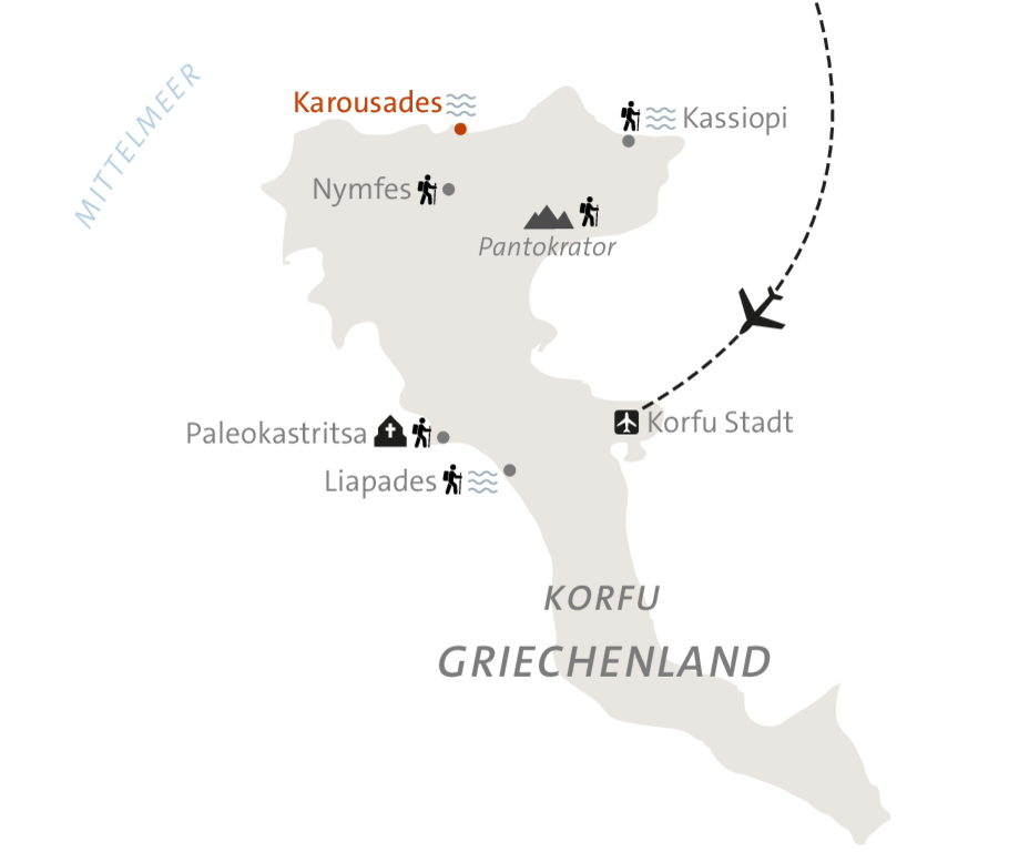 <Willkommen auf Korfu! Nach der Landung wirst du von einem ASI-Vertreter herzlich empfangen und zu deinem Hotel gebracht. Das Rauschen des Meeres und der Duft von Oliven und Zypressen stimmen dich auf die bevorstehenden Wandertage ein.