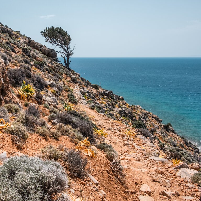 <Heute erleben wir die einzigartige Flora und Fauna der Region sowie das kristallklare Wasser in Lissos. Nach einem Transfer ins lebendige Paleochora wandern wir gemeinsam bergauf bis zum Kap Flomes, einem vorspringenden Ausläufer der Steilküste – eine tolle Aussicht ist garantiert. Auf der Landzunge befinden sich die Ruinen des antiken Lissos mit dem Asklepios-Tempel und der ehemaligen Quelle des Heiligtums. Eine friedliche Atmosphäre, die zum Verweilen einlädt. Der Fernwanderweg E4 verläuft durch die grüne Lissos-Schlucht in einem ausgetrockneten Flussbett. Wir wandern durch die beeindruckenden Felswände und erreichen am Ende unser Etappenziel Sougia mit seinen gemütlichen Cafés und Tavernen.
