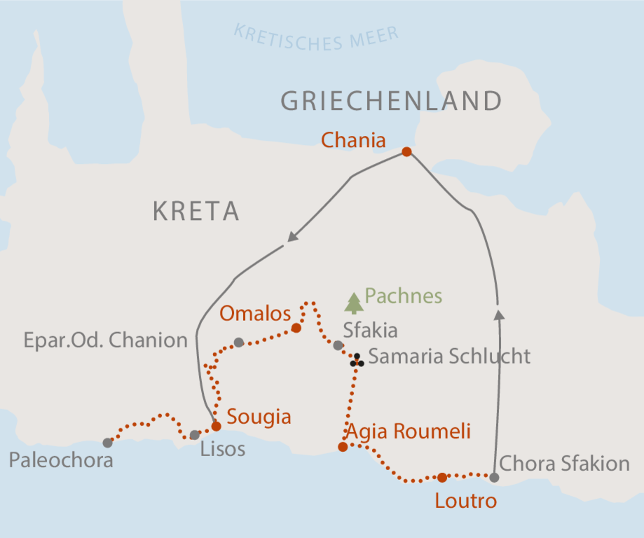<Ankunft in Chania. Du wirst am Flughafen von einem ASI Vertreter abgeholt und ins Hotel gefahren. Abhängig von unserer Ankunftszeit, haben wir eventuell Zeit für einen ersten Strandspaziergang im kleinen Ort Sougia, wo wir von der Hektik des Alltags abschalten können. Am Abend um 19.00 Uhr stellt uns unser Guide die gemeinsame Wanderwoche vor.