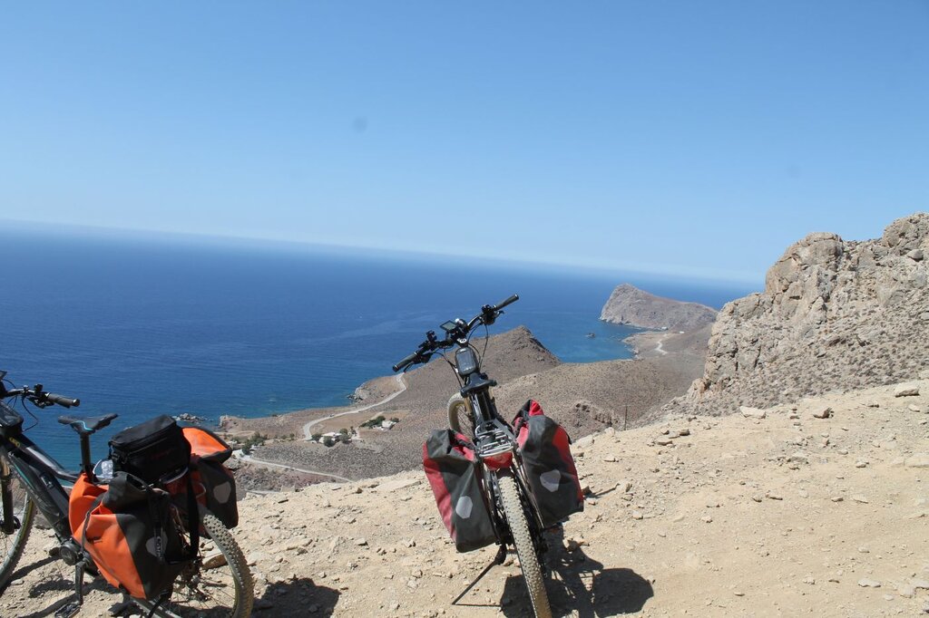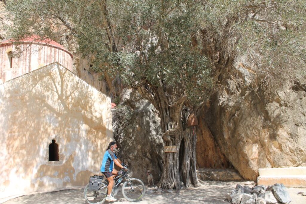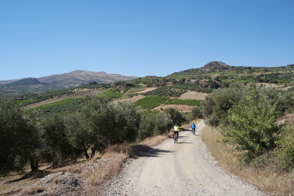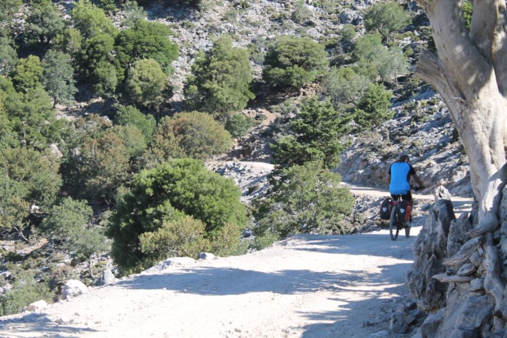 <Heute geht es Richtung Süden erstmal durch ein sehr schönes Tal bis wir nach mehreren Hügeln und einigen Kilometern den Fuß des Asteroussia-Gebirges erreichen. Wir fahren weiter Richtung Osten, vorbei an vielen Dörfern bis zum Ort Charakas. Von hier aus geht es südlich bergauf auf eine Höhe von 630 m, bis sich das Libysche Meer beeindruckend vor uns ausbreitet. Mit einem atemberaubenden Blick radeln wir 5 km bergab und haben das türkisblaue Meer zum Greifen nah. Der Geruch von Thymian und Salbei, sowie das Summen der Bienen begleiten uns während der gesamten Abfahrt. Panagiotis und seine Frau Marinela erwarten uns in ihrer Taverne direkt am Strand von Tris Ekklisies, wo wir die kretische Küche genießen.
