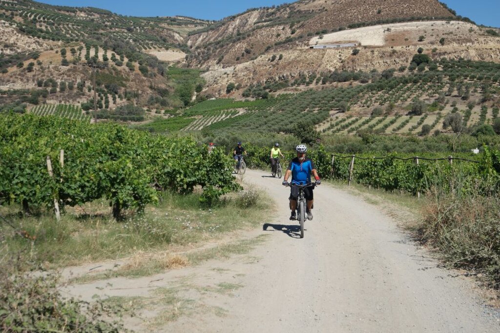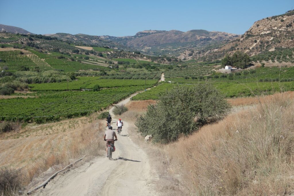 <Nach einer Erklärung der Funktion der E-Bikes radeln wir 1 km zu einem Café, wo wir täglich gemeinsam frühstücken. Wir erleben heute 4 verschiedene Landschaften Kretas: Üppiges Grün mit Weinbergen und Olivenhainen, die fruchtbare Messara-Ebene, die karge Bergwelt des Asteroussia-Gebirges und die wilde Schönheit und das Blau des Libyschen Meeres. Es geht los Richtung Süden bis wir nach 12 km das Dorf Agios Thomas erreichen. Hier besichtigen wir alte römische Gräber. Auf einer verkehrsarmen Strecke fahren wir 36 km weiter bis zum Dorf Vassiliki am Fuße des Asteroussia-Gebirges. Anfangs fahren wir bergauf über eine malerische und serpentinenreiche Straße und später über eine panoramische Straße bergab zum Fischerdorf Lentas. Der Fels über dem Dorf in Form eines Löwes (Leontas) gibt dem Dorf seinen Namen. Wir fahren an Lentas vorbei zum kleinen Ort Dyskos, wo das Meer zu einem erfrischenden Bad einlädt. Bei Frau Voula kann bei kalten Getränken und einem üppigen Mittagessen vor der Heimreise das fantastische Panorama genossen werden.
