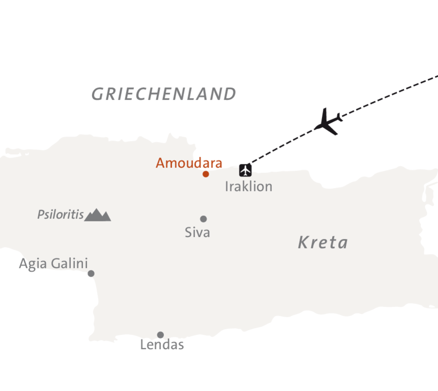 <Wir fahren in Richtung Dorf Kyparissi und weiter Richtung Osten, wo wir zunächst nach 11 km das Dorf Profitis Ilias erreichen. Von hier geht es weiter Richtung Osten zum Berg Juchtas. Unzählige Weinberge und endlose Olivenhaine säumen unseren Weg, eine für Kreta typische Vegetation. Hier in der Nähe liegt das malerische Dorf Choudetsi (23 km), das Dorf, wo der bekannte irische Musiker Ross Daly jedes Jahr ein internationales Musik-Festival organisiert. Zahlreiche Gäste von überall kommen in den Genuss von Musik, Theater, Kulinarik und einem außergewöhnlichen Ambiente. Anschließend besuchen wir das historische Kloster Agarathos (36 km) mit seinem historischen Museum. Hier leben 12 Mönche, die auch hochwertiges Olivenöl und andere Naturprodukte verkaufen. Unser Weg führt uns weiter Richtung Norden, vorbei am Dorf Episkopi bis wir den Strand von Karteros erreichen. Vor oder nach dem Mittagessen wartet hier ein erfrischendes Bad im Meer.