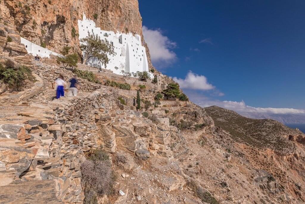 <Besuche heute die gebirgige Insel Amorgos, die durch Luc Bressons Film "The Big Blue" bekannt wurde. Auf Amorgos gibt es Hinweise auf eine Gesellschaft, die bis 4000 v. Chr. zurückreicht! In Katapola, dem Haupthafen der Insel, siehst du klassische Kykladenarchitektur mit Windmühlen und einer alten venezianischen Burg. Spaziere am Hafen entlang, erkunde die alte minoische Siedlung oder besuche das Dorf Hora (Amorgos-Stadt), das hoch oben auf dem felsigen Berghang liegt. Vielleicht fährst du zum Kloster Moni Hozoviotissis aus dem 11. Jahrhundert, das sich an die Felswand klammert und einen Blick über die Ägäis bietet.