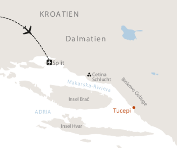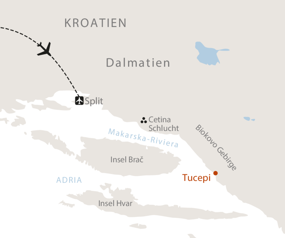 <Wir fahren der Küste entlang Richtung Omiš und starten in Lokva Rogoznica unsere heutige Etappe. Ein stetiger Anstieg führt uns auf einen Sattel oberhalb der Adria. Schritt für Schritt öffnet sich der Blick über das tiefblaue Meer, das Cetina-Delta und die Insel Brač. Am Sattel erreichen wir die kleine Schutzhütte Luda Kuća, bevor wir auf einem aussichtsreichen Pfad ins stille Bergdorf Podašpilje absteigen. Eine abwechslungsreiche Etappe zwischen Meerblick und Berglandschaft – ideal, um die Vielfalt Dalmatiens zu erleben.