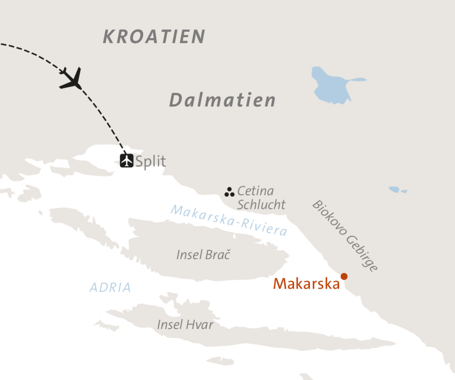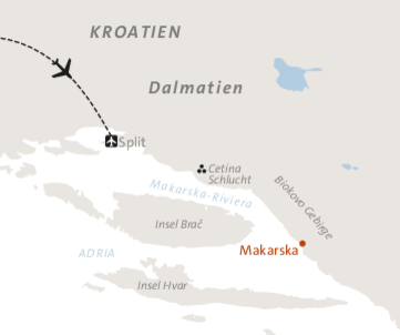 <Nach dem Flug nach Split erfolgt der Transfer zum Hotel in Makarska. Gegen 19 Uhr begrüßt uns unser ASI-Bergwanderführer in der Lobby, und wir lernen die Mitreisenden kennen. Bei einem gemeinsamen Abendessen lassen wir den Anreisetag gemütlich ausklingen und stimmen uns auf die bevorstehende Wanderwoche ein.