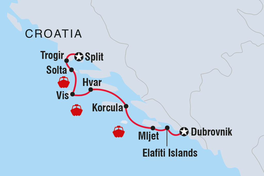 Dobro Dosli! Willkommen in Kroatien. Dein Abenteuer beginnt in Dubrovnik mit einem Gruppentreffen um 15 Uhr. Wenn du früher ankommst, kannst du Dubrovnik - das unbestrittene Juwel der dalmatinischen Küste - auf eigene Faust erkunden. Mit dem glitzernden Wasser der Adria im Hintergrund ist diese malerische, mittelalterliche Stadt voller Charakter und perfekt, um sie auf zwei Beinen zu erkunden (besonders, wenn du ein Game of Thrones-Fan bist). Nach dem Treffen gehst du in den örtlichen Supermarkt, um dich mit Vorräten für deine Reise einzudecken. Dann gehst du an Bord der Yacht und segelst durch die offenen Gewässer der Adria zu den Elafiti-Inseln. Elafiti besteht aus drei Hauptinseln - Kolocep (bekannt als die grüne Insel wegen ihrer 100 Jahre alten Kiefernwälder, Weihnachtsbäume, Olivenhaine und Zitrusbäume), Lopud (diese Insel hat spektakuläre Parks und Strände und ist eine der am besten entwickelten touristischen Inseln in der Umgebung von Dubrovnik) und Sipan (die größte der Inselgruppe mit einer langen Geschichte voller Geschichten und Legenden, die als eines der Juwelen der Region gilt).