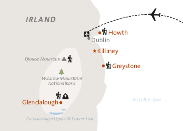Von unserem Standort zwischen den beiden hübschen Ortschaften Dalkey und Killiney erkunden wir die schönen Wicklow Mountains, die Küstenorte und Dublin zu Fuß. Unser Hotel liegt nahe dem charmanten Ort Dalkey, mit mehreren kleinen Häfen und einer tollen Küstenstraße, wo es auch Möglichkeiten zum Schwimmen gibt. Eine schöne Reise, um einen ersten Eindruck der grünen Insel zu erhalten, die Lust auf mehr macht. Die Wege sind kurz und der Umwelt zuliebe nutzen wir, wann immer möglich, öffentliche Verkehrsmittel für die notwendigen Transfers.