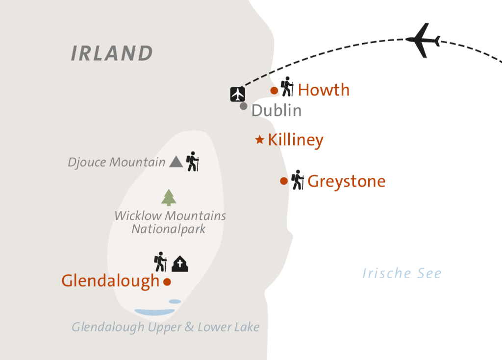 <Flug nach Dublin. Am Flughafen wirst du von einem ASI-Vertreter empfangen und ins Hotel im Küstenort Killiney gebracht, der südlich von Dublin liegt. Auf der Fahrt bekommst du erste Eindrücke von Irlands Landschaft und stimmst dich auf deine Wanderwoche ein.
