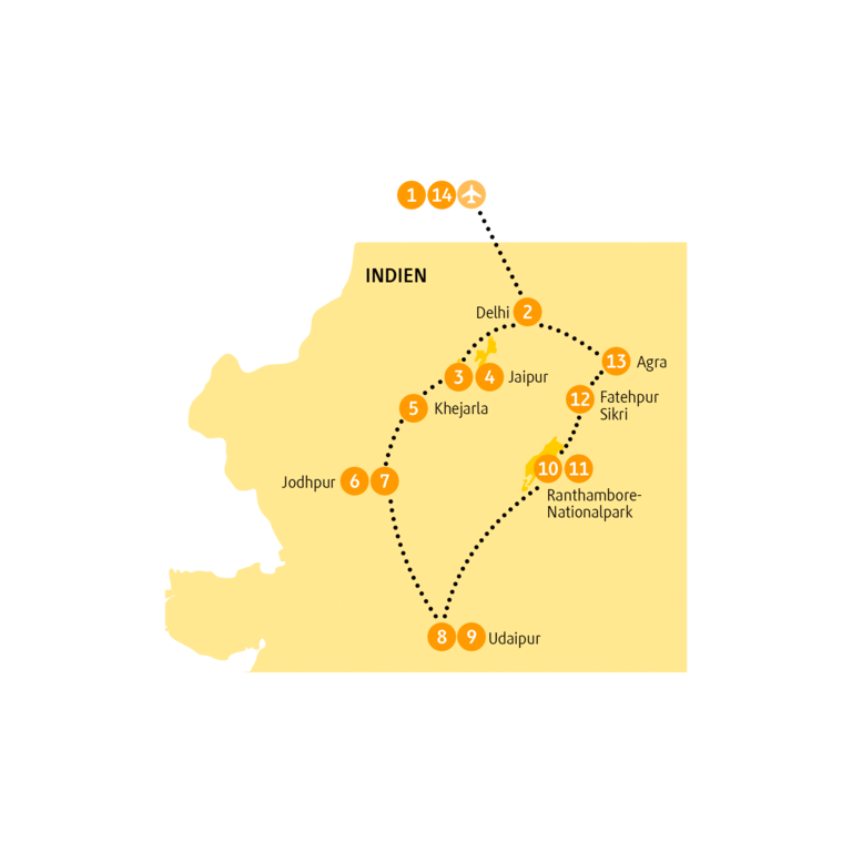- 2 Safaris im offenen Safariwagen im Ranthambore-Nationalpark, Geländewagenfahrt durch die Wüste Thar, Bootsfahrt auf dem Pichhola-See in Udaipur, Tuk-Tuk-Fahrt und Yogastunde in Jodhpur