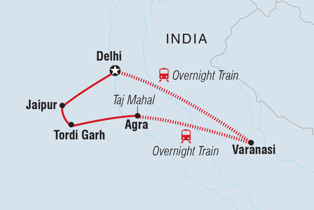 <Heute hast du viel freie Zeit, um Varanasi zu erkunden, bevor du an Bord eines Nachtzuges nach Agra (ca. 13 Stunden) einen einzigartigen Einblick in das indische Leben bekommst. Du könntest einen Ausflug ins nahegelegene Sarnath machen, einen der vier wichtigsten buddhistischen Pilgerorte und die Stätte, an der Buddha seine Botschaft vom Weg zur Erleuchtung verkündete. Außerdem gibt es am östlichen Ufer des Ganges die verfallene Festung und den Palast Ram Nagar Fort aus dem 17. Varanasi ist die Heimat der indischen Seidenindustrie, also erkunde die vielen Seidenmärkte in der Stadt oder nutze die Gelegenheit, um dein Yoga am ultimativen Ort der Chakra-Balance zu perfektionieren. -