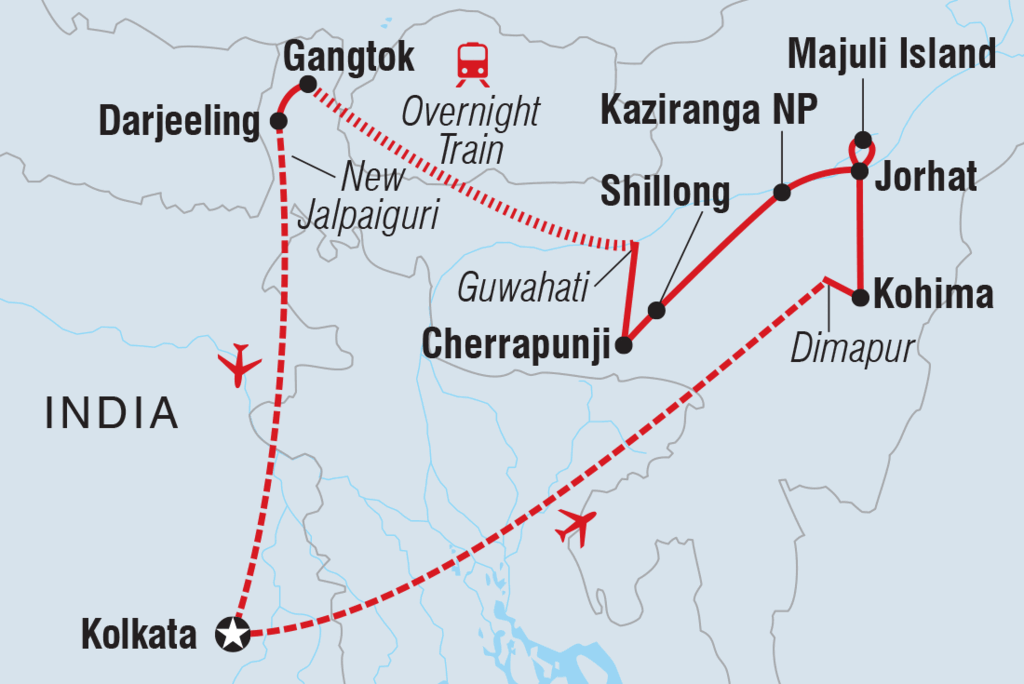 Begib dich auf ein 16-tägiges Abenteuer durch die Wildtierreservate, Feuchtgebiete und weitläufigen Bergdörfer im Nordosten Indiens. Lerne die Kulturen von Sikkim, Assam und Nagaland kennen, suche im Kaziranga-Nationalpark nach dem legendären Einhorn-Nashorn und pflücke in Darjeeling zusammen mit einer lokalen Bauerngemeinschaft Teeblätter. Erkunde die schwimmenden Dörfer auf der Insel Majuli, besuche das umstrittene Rumtek-Kloster in Gangtok und sieh dir eine lebende Wurzelbrücke an - das Kunstwerk des Khasi-Volkes.