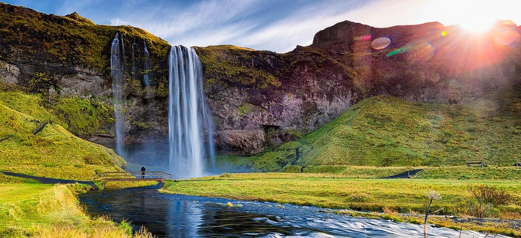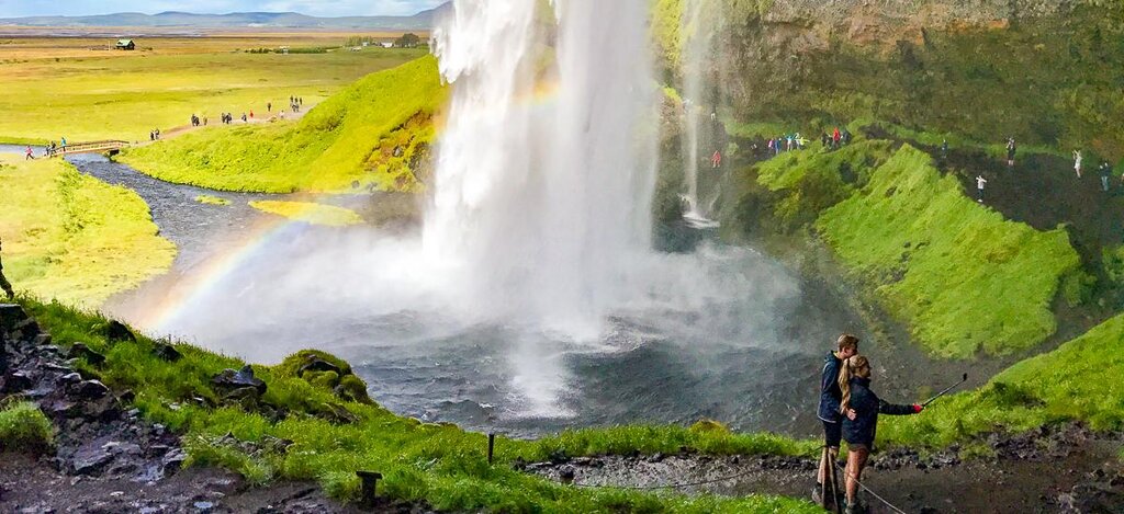 <Nach dem Frühstück geht es zunächst zum Wasserfall Seljalandsfoss, hinter dessen Wasserschleier man im Sommer trockenen Fußes entlang spazieren kann, wenn Wind und Wetter es zulassen. Anschließend wartet der imposante Wasserfall Skógafoss auf deinen Besuch, der sich mit donnernd über 60 Meter in die Tiefe stürzt. Die Fahrt geht dann weiter entlang der Südküste zum Kap Dyrhólaey, der Südspitze Insel, wo dich eine herrliche Landschaft erwartet. Hier ragen Vogelklippen neben langgezogenen Lavastränden in die Höhe. Was für ein Anblick, wenn die weiße Gischt der Wellen über das schwarze Ufer rollt. Barfuß durch den Sand solltest du hier auch ohne »Superkräfte« laufen können.