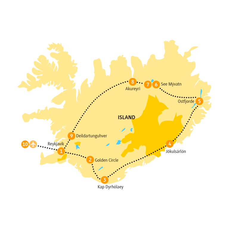 Bitte halte dich um 9:30 Uhr mit deinem Gepäck in der Lobby bereit. Du triffst deine Reiseleitung und startest das Islandabenteuer.
