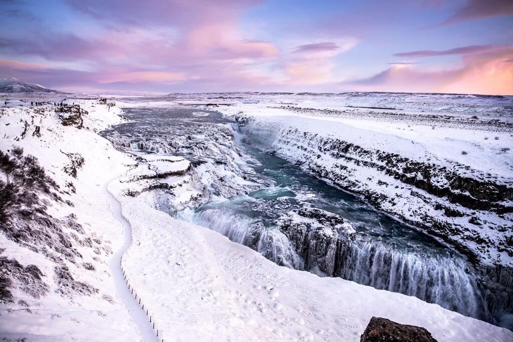 <Morgens packen wir unsere Sachen und besuchen den auch im Winter kraftvoll in die Tiefe stürzenden Gullfoss. Von dort ist es nicht weit bis zum berühmten Geysir, dessen brodelnde Kraft in der eisigen Landschaft besonders eindrucksvoll erscheint. -