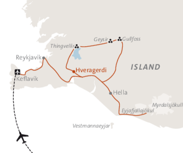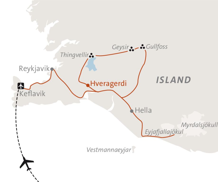<Flug nach Keflavik. Am Flughafen wirst du von einem ASI Vertreter abgeholt und in unser Hotel im kleinen Örtchen Hveragerdi gefahren.