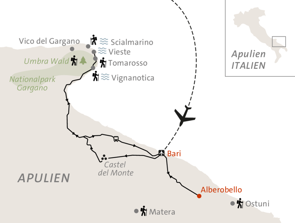 <Mit dem Flug nach Bari beginnt dein Abenteuer im Süden Italiens. Am Flughafen wirst du herzlich von einem ASI-Vertreter empfangen und in dein Hotel gebracht, wo die Reise sanft ihren Auftakt nimmt. Am Abend eröffnet unser Guide die gemeinsame Wanderwoche und gibt uns einen Vorgeschmack auf die Erlebnisse, die uns erwarten – eine perfekte Einstimmung auf Apuliens Vielfalt.