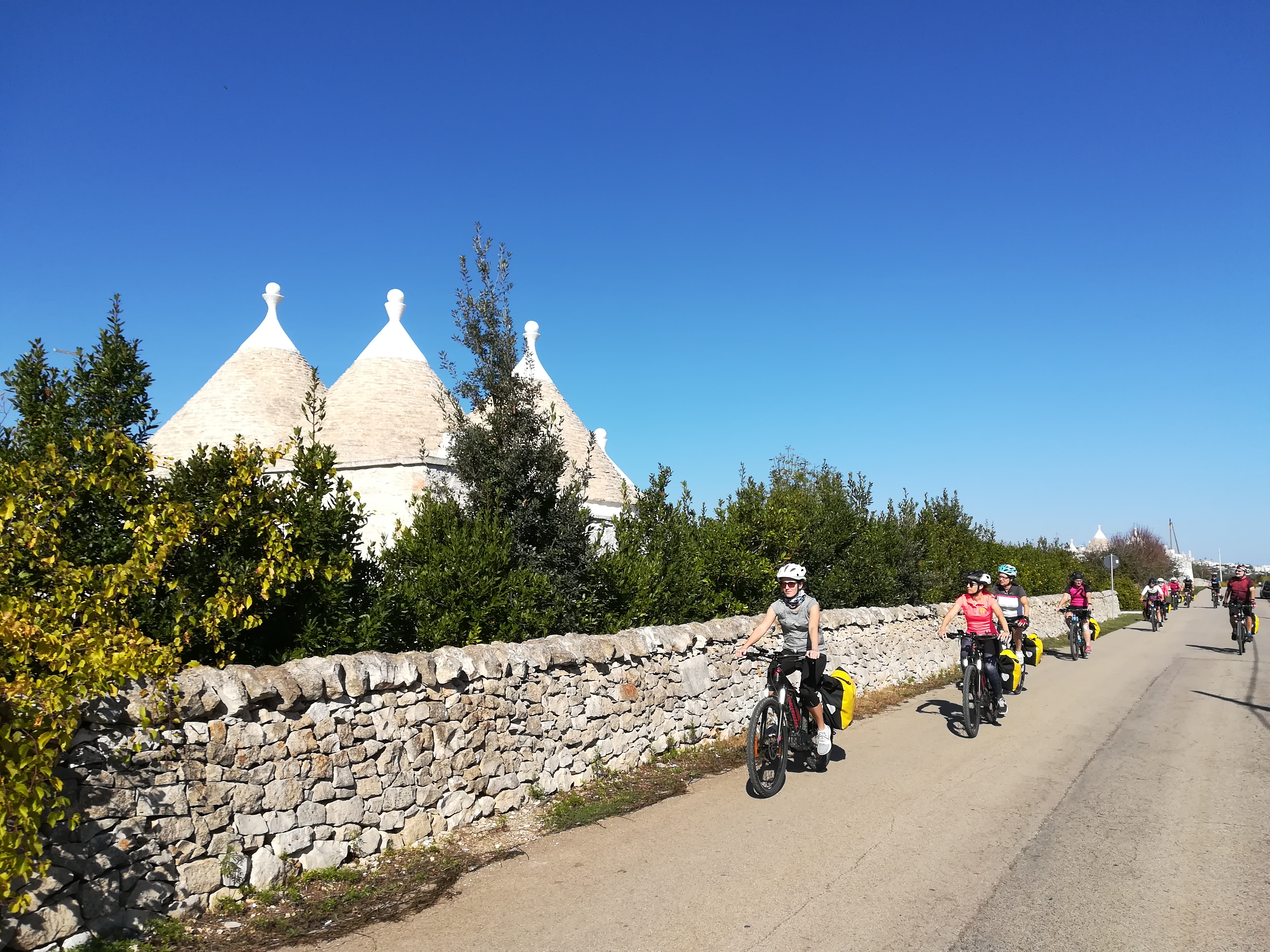 <Heute radeln Sie durch das Itria Tal: Das Mosaik aus Weingütern, Olivenhainen, Wäldern und Feldern wird nur ab und zu von kleinen weißen Mauern und Trullisiedlungen unterbrochen. Auf Ihrem Weg passieren Sie die Dörfer Cisternino und Locorotndo mit Ihren hübschen und gepflegten Altstädten. Etappenziel ist ALBEROBELLO, die "Hauptstadt der Trulli“ (einzigartige Gebäudekonstruktion mit den eigenartigen Kegeldächern), die 1996 zum UNESCO Weltkulturerbe erklärt wurde.