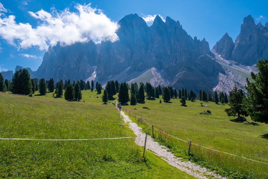 <Vom Hotel aus starten wir in den Tag und wandern hinauf zum Unteren Herrensteig – ein wahrer Panoramasteig, der uns mit atemberaubenden Ausblicken verwöhnt. Auf halber Höhe des Aferer Geisler-Tals geht es taleinwärts, immer begleitet von den markanten Spitzen der Geislergruppe und den weitläufigen Gampenwiesen unter uns. Zum Abschluss kehren wir zurück zur vertrauten Zanser Alm und von dort mit dem Linienbus zurück ins Hotel.