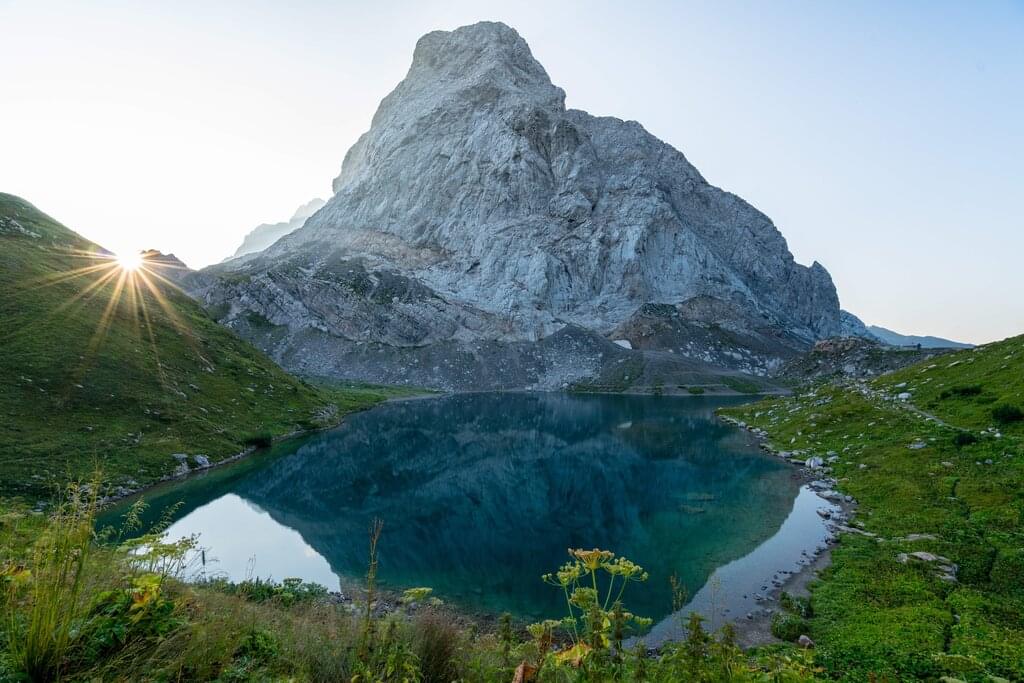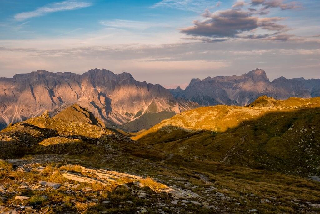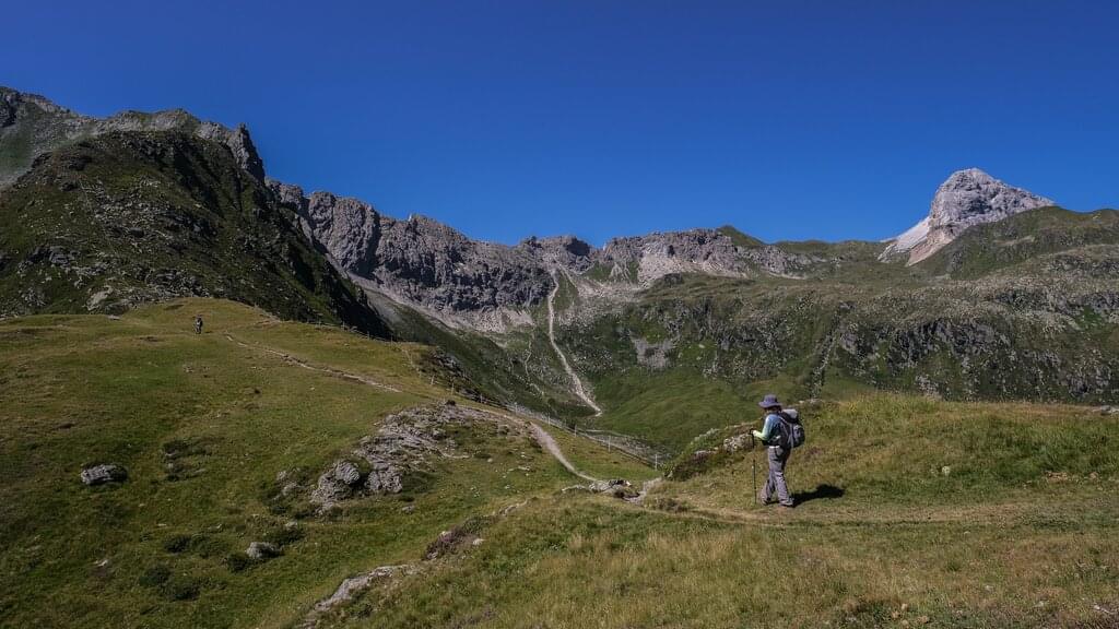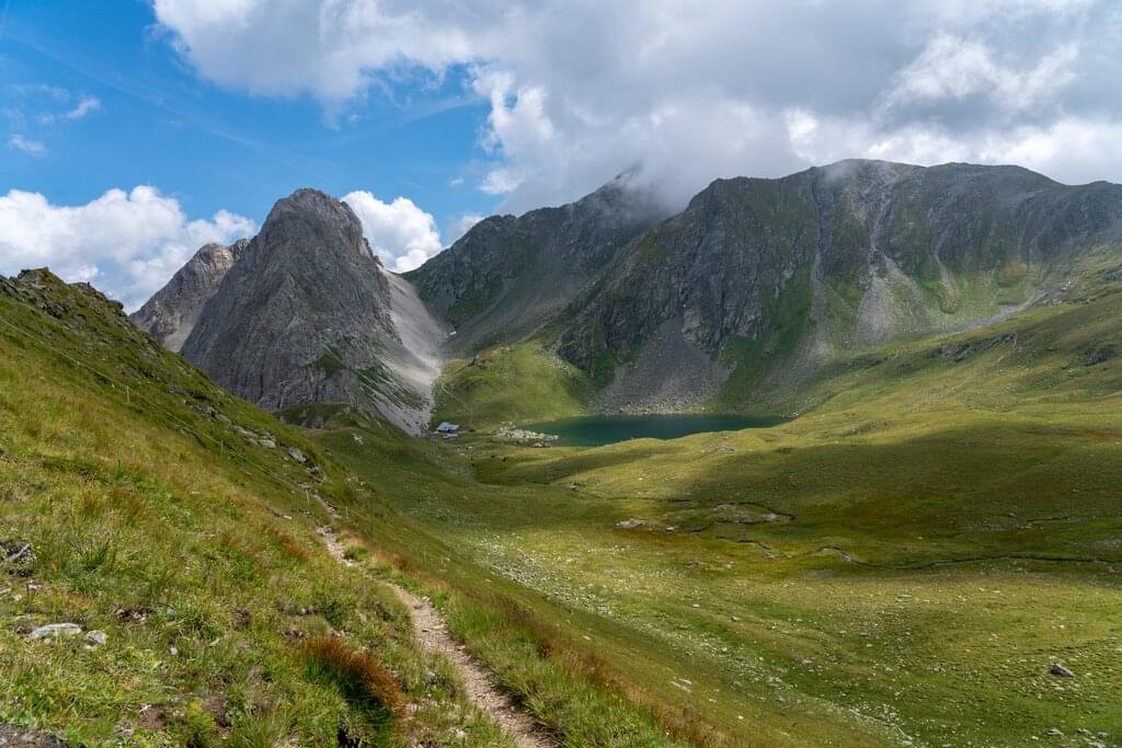 <Heute überschreiten wir am Öfnerjoch die Grenze nach Italien. Im stillen Fleinstal wandern wir über weite Wiesen und durch lichte Wälder. Nach dem Sella Sissanis glänzt der Lago Pera tiefblau im Sonnenlicht. Über den Giramondopass kehren wir zurück nach Österreich und erreichen schließlich die traumhaft gelegene Wolayerseehütte.