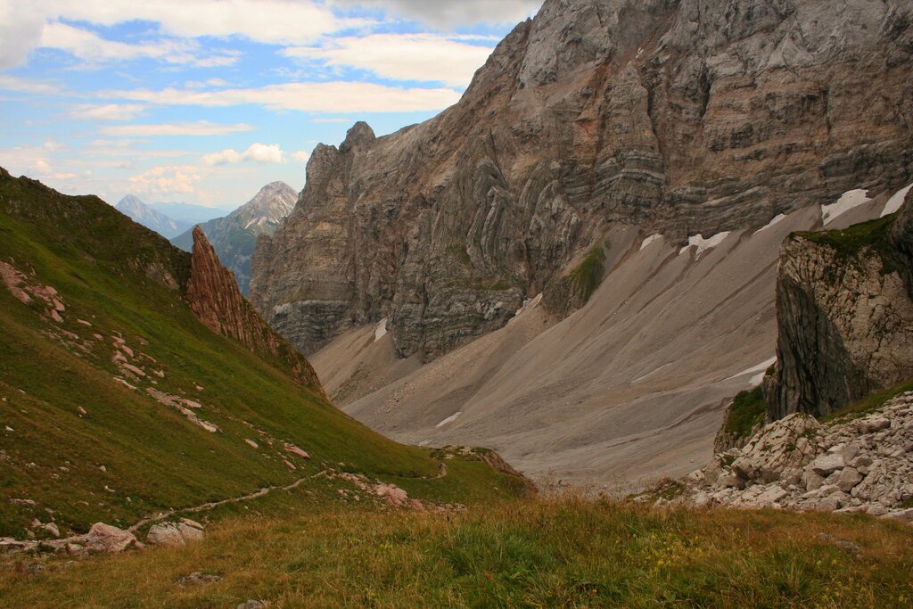 <Heute steht unsere längste Etappe am Karnischen Höhenweg bevor – fordernd, aber unvergesslich. Entlang der Grenze folgen wir dem Friedensweg über die Retterkar- und Steinkarspitze. Das Hochweißsteinmassiv baut sich dabei immer imposanter vor uns auf. Der Weg führt dabei durch schroffes Gelände, das unsere Konzentration und Trittsicherheit fordert. Nach einem langen Tag erreichen wir das idyllisch gelegene Hochweißsteinhaus.