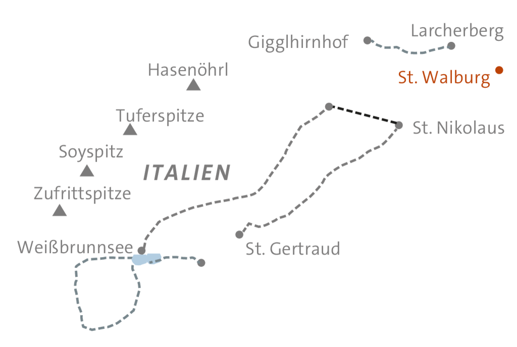 Am Anreisetag treffen wir uns um 18:30 Uhr im Hotel Unterpichl, St. Walburg, Unterpichl, 39016 Ulten. Tel: +39 0473 795479.