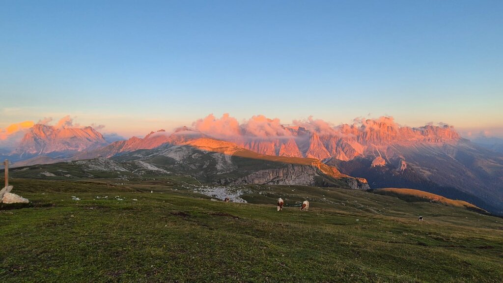 <Dieser Weg begeistert uns vom Rifugio d'Antermoia bis zum Passo di Dona auf 2.516 m. Danach steigen wir ins Valle di Duron zur Malga Docoldaura ab, bevor es über das Mahlknechtjoch auf 2.187 m hinauf zur Tierser Alpl Hütte auf 2.440 m weitergeht. Die Tierser Alpl liegt direkt unterhalb der berühmten Rosszähne und zum Sonnenuntergang genießen wir großes Dolomitenkino von Sellastock bis Marmolada.