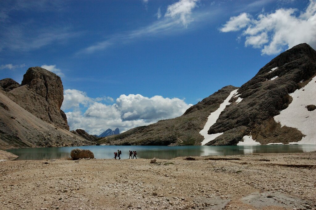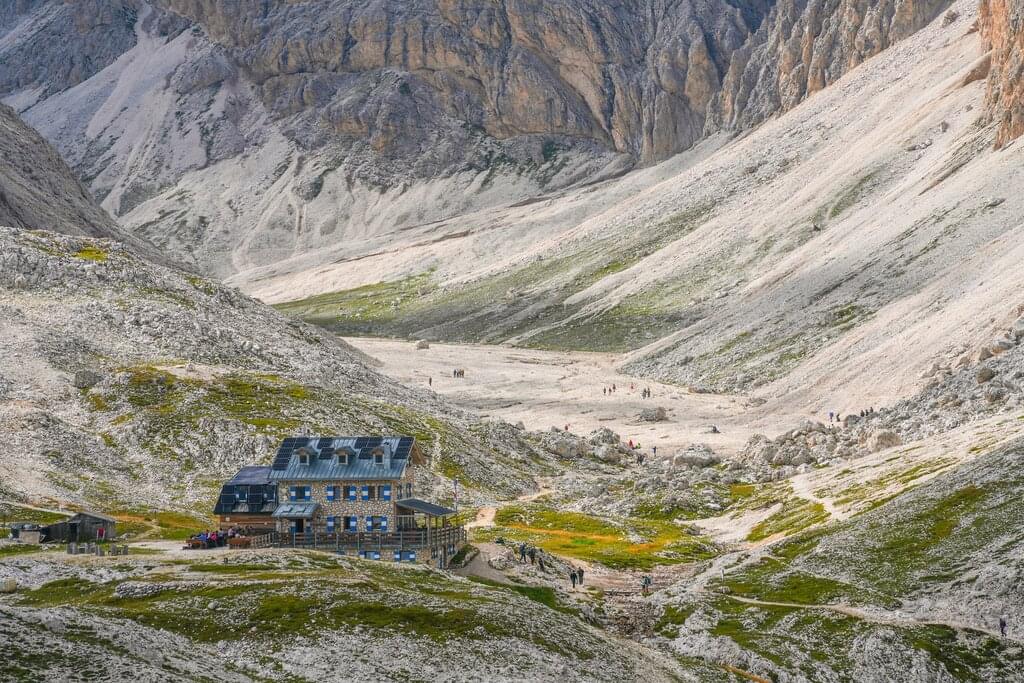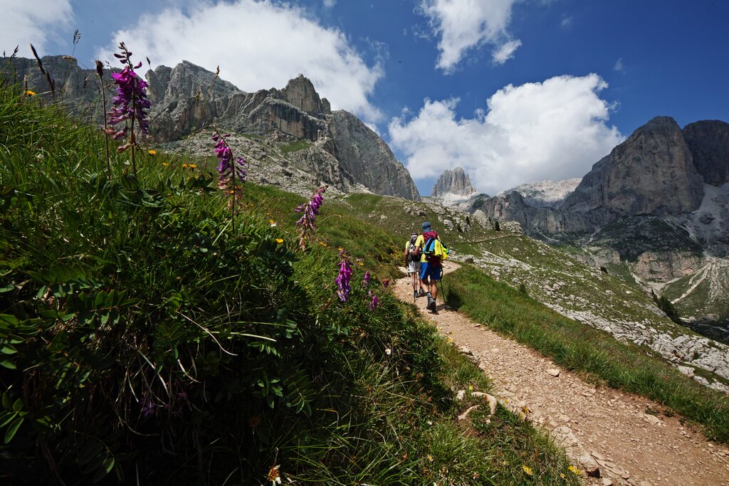 <Wir queren am Hirzelweg unter den beeindruckenden Felswänden der Rotwand bis zum Christomanno-Denkmal über dem Karerpass. Nach einer kleinen Stärkung in der Rotwandhütte wandern wir weiter über den Schafsteig bis zur Vajolett-Hütte auf 2.243 m und genießen unterwegs die spektakuläre Dolomitenkulisse.