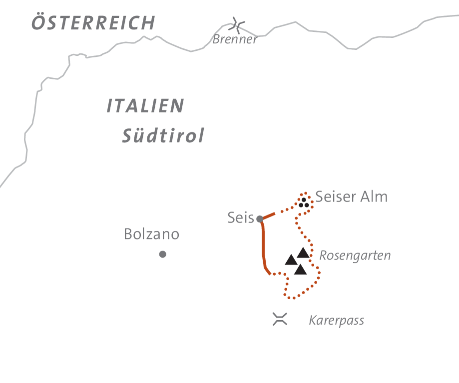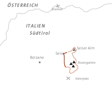 Am Anreisetag treffen wir uns um 14:00 Uhr im Santner’s Restaurant/Pizzeria an der Talstation der Seiser Alm Bahn in Seis am Schlern (Tel.: +39 335 6829469). Solltest du dich verspäten, informiere bitte über diese Telefonnummer unseren ASI-Bergwanderführer.