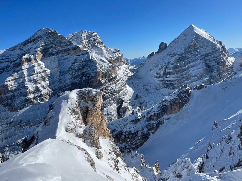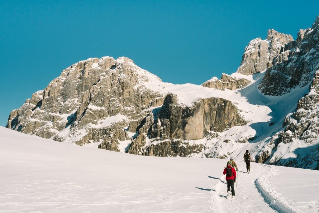 <Unsere längste Schneeschuhtour führt uns auf den Heiligkreuzkofel, den bekanntesten Gipfel der Fanes. Über das weitläufige Gelände der Fanesalm steigen wir auf bis zur Kreuzkofelscharte (2.612 m) und von hier über einen langen Gratrücken weiter zum Gipfel. Die vor unseren Füßen abbrechende Westwand gehört zu den markantesten Kletterwänden der Dolomiten – Reinhold Messner gelang hier 1968 eine der bis dahin schwierigsten Kletterrouten der Alpen. Wir genießen lieber die überwältigende Aussicht, bevor der Abstieg über die Fanes-Hochfläche zurück zur Hütte startet.