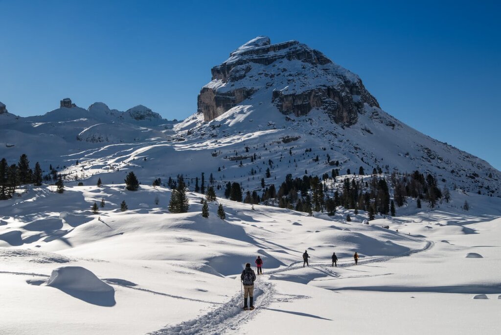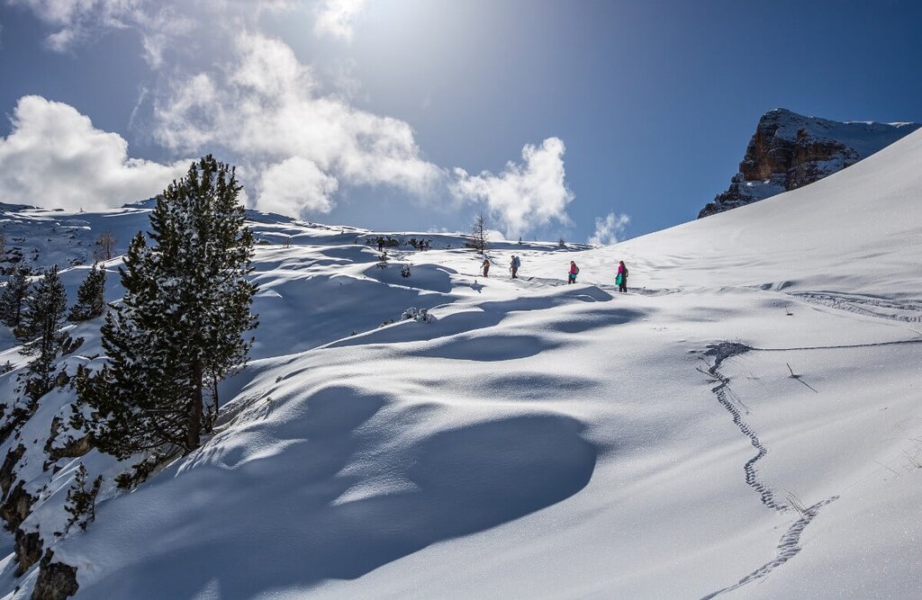 Auf der Fanesalm steht in 2.060 m Höhe in einer der schönsten Landschaften der Dolomiten die ausgesprochen komfortable Faneshütte. Sanftes Gelände, kleine steilere Hänge, aussichtsreiche Gipfel und eine überdurchschnittlich hohe Sonnenscheindauer - das sind die Zutaten für eine perfekte Tourenwoche und machen das Gebiet ideal zum Schneeschuhwandern. Unsere Touren führen hinein ins Herz der Faneshochfläche, zum Felsgebilde des Ciastel de Fanes (2.657 m), auch "Fanes-Schloss" genannt oder zum Monte Castello, mit Ausblick zu den Dreitausendern der südlichen Dolomiten.