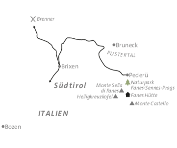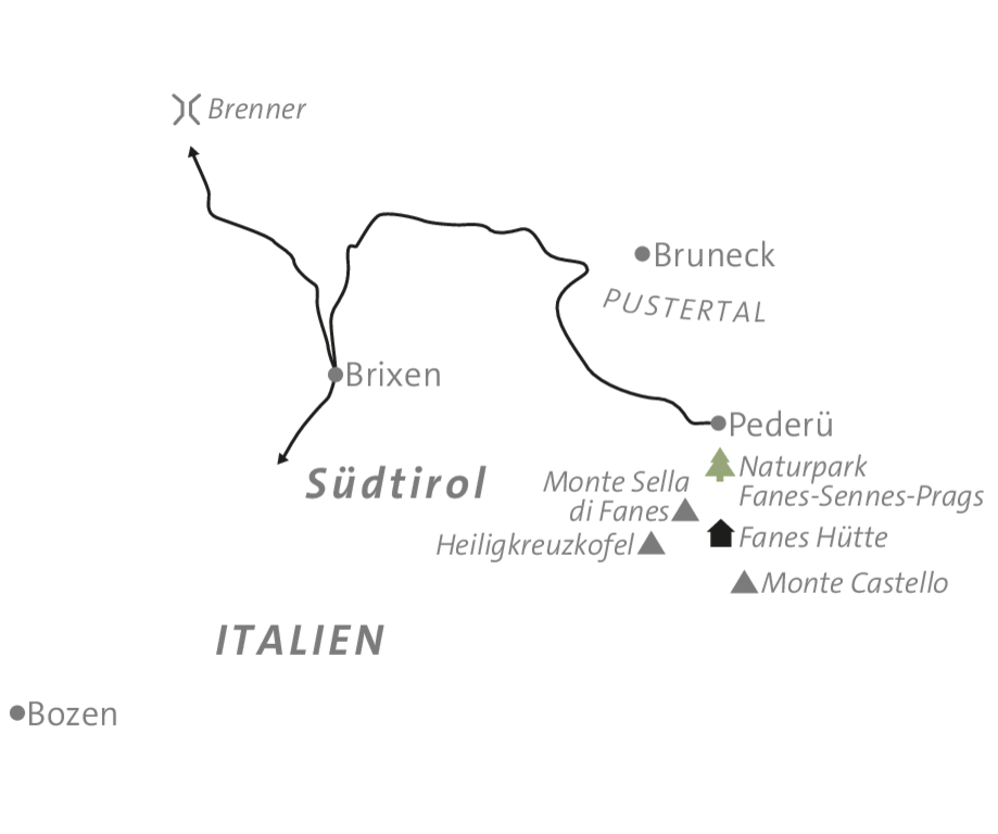Am Anreisetag treffen wir uns um 14:00 Uhr am Parkplatz des Berggasthauses Pederü, Strada Val dei Tamersc 16, I-39030 St. Vigil in Enneberg, Tel.: +39-0474-501086. Bei unerwarteter Verspätung bitten wir, dich über diese Telefonnummer mit dem ASI-Bergführer in Verbindung zu setzen.