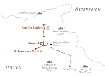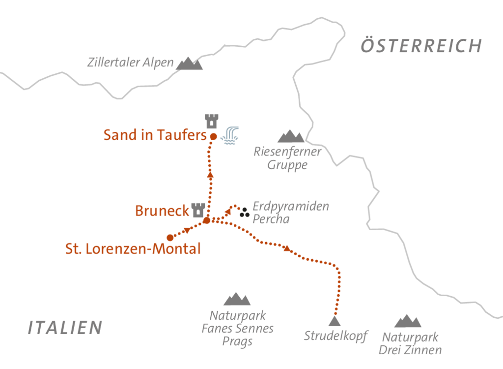<Heute starten wir direkt vom Hotel zu einer aussichtsreichen Wanderung nach Bruneck. Unterwegs öffnen sich immer wieder Blicke auf das weite Tal, bis wir das lebendige Zentrum des Pustertals erreichen. Dort besuchen wir das Messner Mountain Museum im Schloss Bruneck – ein spannender Ort, an dem Berggeschichte lebendig wird. Danach bleibt Zeit für einen Bummel durch die malerische Altstadt mit ihren kleinen Gassen, Cafés und Boutiquen. Ein Südtiroler Mittagessen rundet diesen Tag ab, bevor wir mit dem Bus zurück zum Hotel fahren.