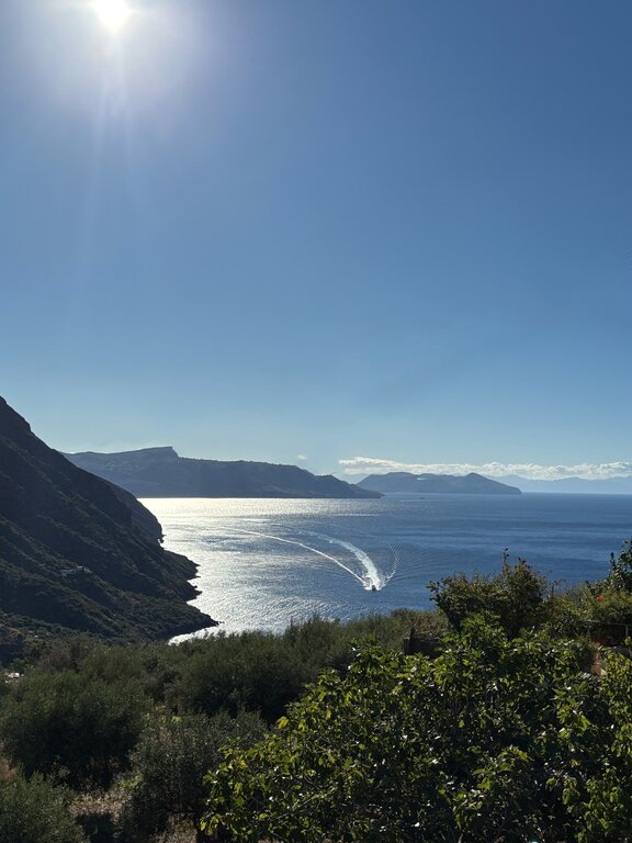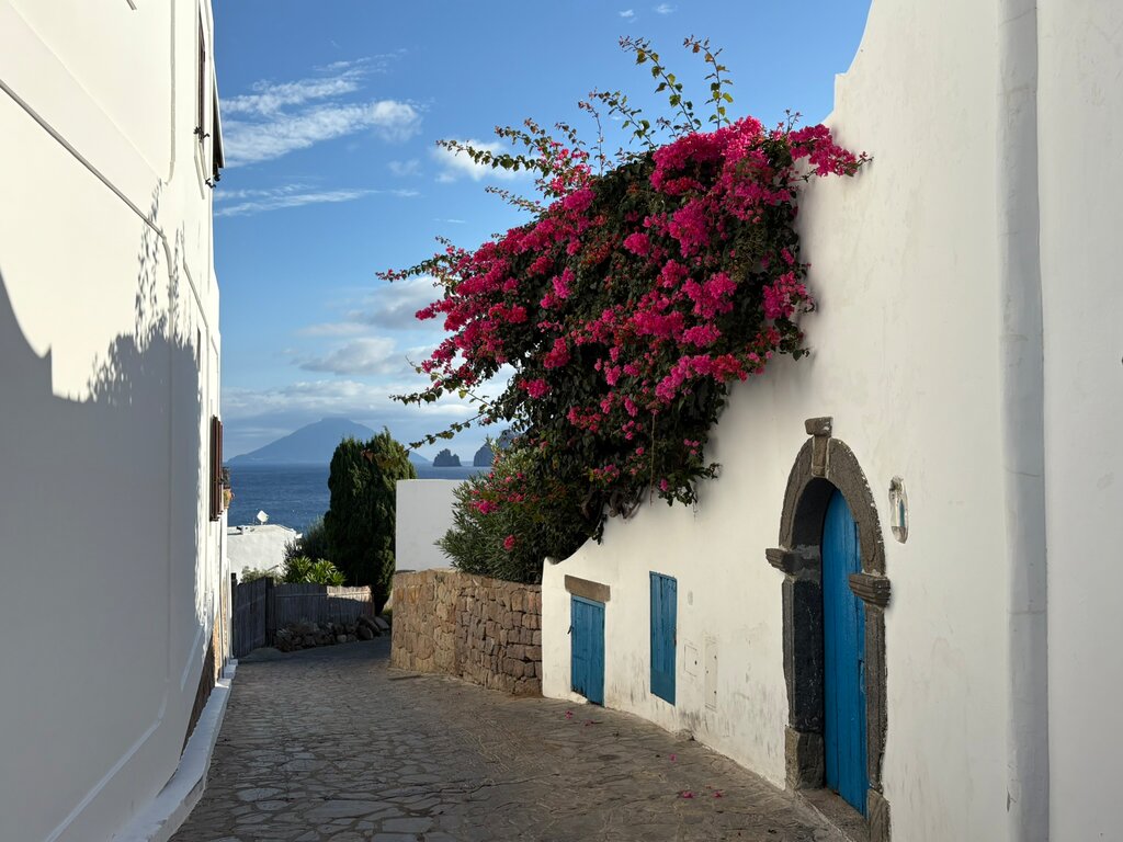 <Mit unserem Boot erreichen wir Filicudi, die wildeste der Äolischen Inseln. Am kleinen Hafen von Pecorini beginnt unser Aufstieg: Über viele Stufen und steingepflasterte Maultierpfade schlängelt sich der Weg durch das Dorf hinauf. Schon bald lassen wir die letzten Häuser hinter uns und tauchen in unberührte Natur ein – Kakteenfelder, Macchia und das Glitzern des Meeres begleiten uns. Ein schmaler Panoramaweg führt uns zum verlassenen Dorf Zucco Grande, geheimnisvoll zwischen Felsen gelegen und bereits von den Griechen bewohnt. Mit Blick auf das prähistorische Dorf Capo Graziano auf der gegenüberliegenden Seite steigen wir durch die üppige Kakteenvegetation zurück zum Hafen. Auf dem Weg dorthin öffnet uns Adelaide ihren Garten und verwöhnt uns mit einem traditionellen Mittagessen, herzlich serviert und unverfälscht wie die Insel selbst.