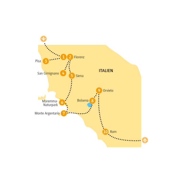 <Heute nimmst du Abschied von Florenz und fährst weiter nach Siena. Die mittelalterliche Stadt liegt malerisch inmitten endloser Weinberge. Hier spazierst du durch enge Gassen, vorbei an Türmen und Adelspalästen. In der Mitte der Stadt steht der aus schwarzem und weißem Marmor gebaute Dom, der mit seiner gotischen Architektur imponiert. Ende des Rundgangs ist auf der Piazza del Campo, auf der seit 1644 zweimal jährlich ein historisches Pferderennen, der sogenannte »Palio« ausgetragen wird. Was in großen Teilen Italiens der Fußball ist, das ist in Siena die Leidenschaft für den Palio. Die unterschiedlichen Stadtviertel, die sogenannten Contraden, treten hierbei gegeneinander an und verwandeln die ganze Stadt in ein historisches Stadtfest. Du schaust dir die Geschichte des Palio ein bisschen genauer an und stattest einem Museum und Mitglied einer Contrade einen Besuch ab. Am Nachmittag geht es weiter nach San Galgano, zur Ruine der Zisterzienserabtei. Gleich wirst du erfahren, was es mit der Legende des Schwerts im Stein auf sich hat. Der Tag endet in der Nähe von Grosseto, wo deine Unterkunft für die nächsten zwei Nächte liegt.