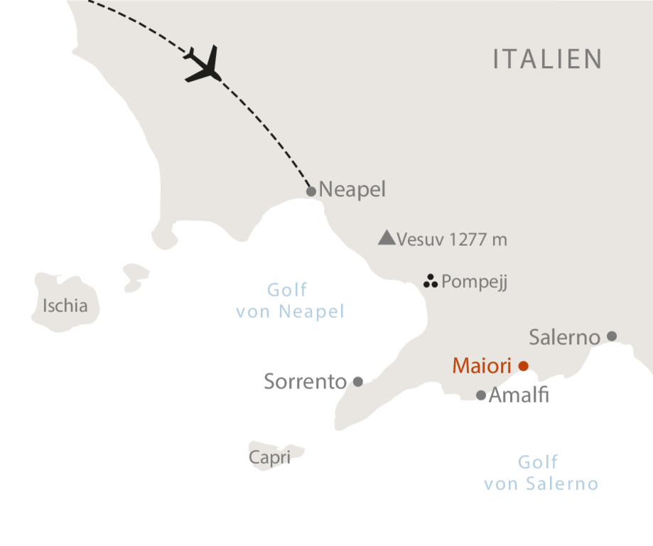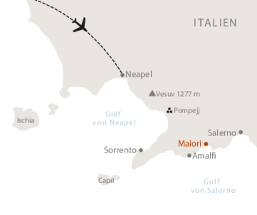 <Wir fliegen nach Neapel, wo uns ein ASI-Vertreter herzlich in Empfang nimmt. Gemütlich fahren wir zum Hotel und lassen den Tag entspannt ausklingen, während wir erste Eindrücke der bezaubernden Amalfiküste sammeln.
