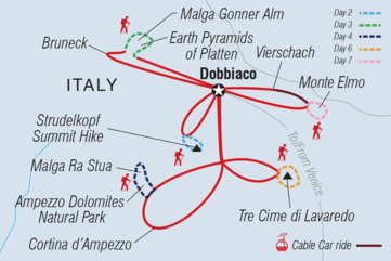 Entdecke die Dolomiten bei einem Wanderabenteuer in einer kleinen Gruppe. Mit leichten bis mittelschweren Wanderungen, günstig gelegenen Unterkünften und einem ortskundigen Reiseleiter, der für einen reibungslosen Ablauf sorgt, bietet diese Reise eine aktive und dennoch gemütliche Möglichkeit, eine der bekanntesten Bergketten Italiens zu erkunden. Von der Alpenstadt Toblach aus - umgeben von spitzen Gipfeln und saftigen Wiesen - wanderst du acht Tage lang durch Landschaften, die zum UNESCO-Welterbe gehören, kehrst in Dorfgasthöfen ein und stärkst dich mit deftigem Bergessen - Apfelstrudel gefällig?