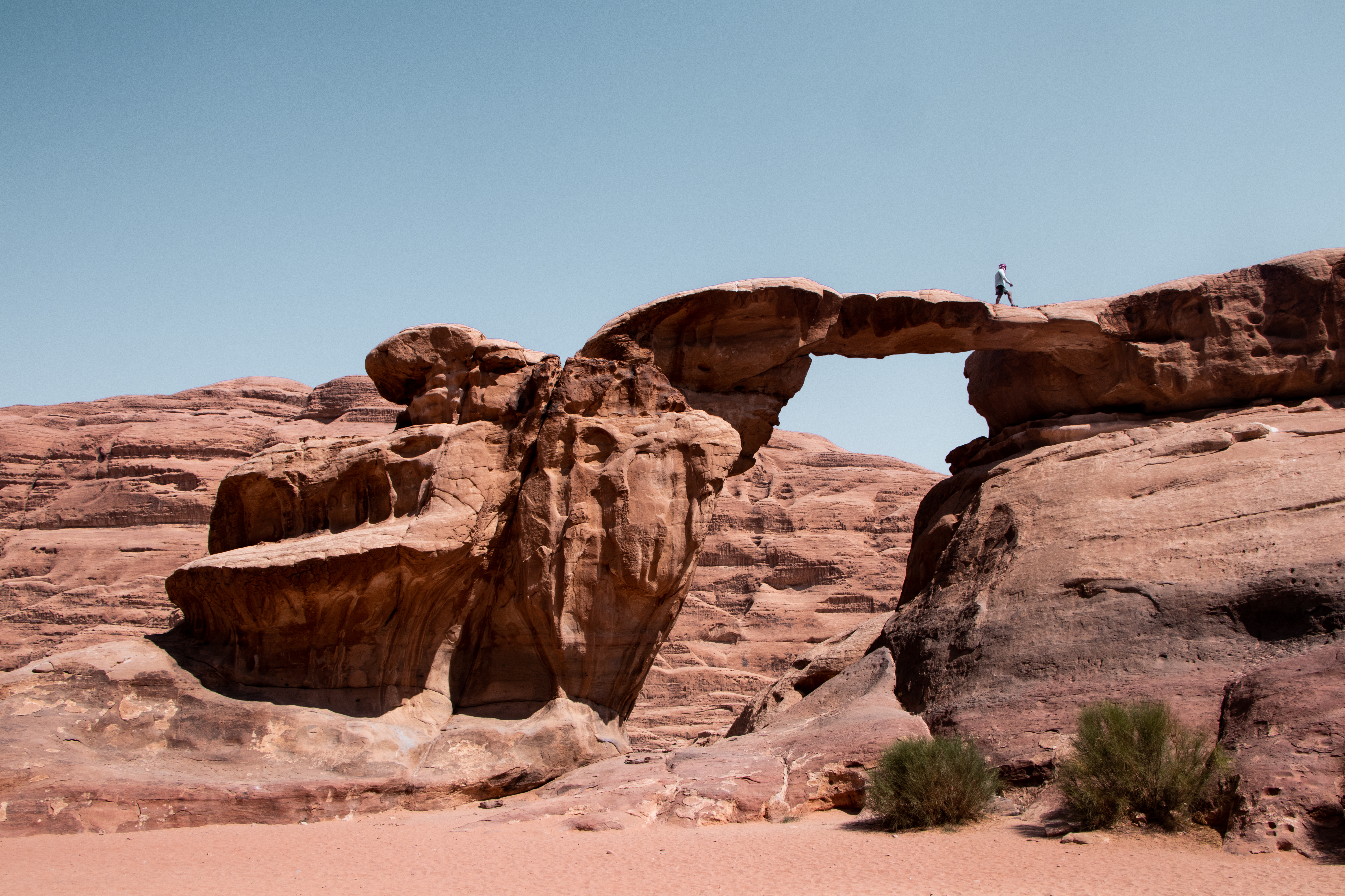 <Unser Ziel ist heute die Umm Fruth Rock Bridge, die nur einen kurzen Spaziergang von unserem Campingplatz entfernt liegt. Der Weg dorthin ist eine mäßige Kletterpartie, die beim Aufstieg leicht zu bewältigen ist. Das Sandsteingelände ist zwar steil, bietet aber sicheren Halt. Auf dem weiteren Weg erreichen wir die faszinierenden Ruinen des Lawrence House, das als Ruhestätte von TE Lawrence, bekannt als Lawrence von Arabien, von großer historischer Bedeutung ist. Am Nachmittag durchqueren wir die abgelegenen roten Sanddünen und genießen die atemberaubenden Ausblicke. Entlang des Weges bieten alte Felsinschriften Einblicke in die Vergangenheit und bereichern unsere Expedition mit Geschichte. Als die Nacht hereinbricht, errichten wir unser Lager am Fuße eines Wüstenbergs und finden einen ruhigen Platz, um den Abend zu verbringen.