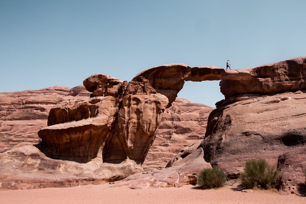 <Heute beginnt unser Abenteuer mit einer Reise zum Jebel Burdah. Auf dieser Route sind einige Kletterpassagen zu bewältigen, und in bestimmten Bereichen werden wir möglicherweise Seile verwenden, insbesondere wenn wir den Gipfel der Burdah-Brücke erklimmen wollen. Diese beeindruckende natürliche Formation spannt sich elegant zwischen zwei Felsmassen und bietet ein atemberaubendes Spektakel. Während der Wanderung bietet sich uns ein atemberaubender Panoramablick. Am Nachmittag fahren wir weiter und erreichen schließlich unseren nächsten Campingplatz auf den Sanddünen in der Nähe des Jebel Umm Fruth, der in der südöstlichen Ecke der Wüste Wadi Rum liegt.