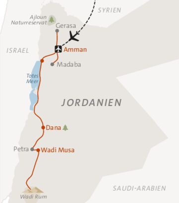 <Flug nach Amman. Am Flughafen wirst du von einem ASI Vertreter abgeholt und in das Hotel gefahren.