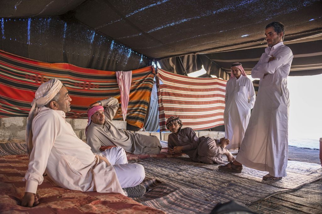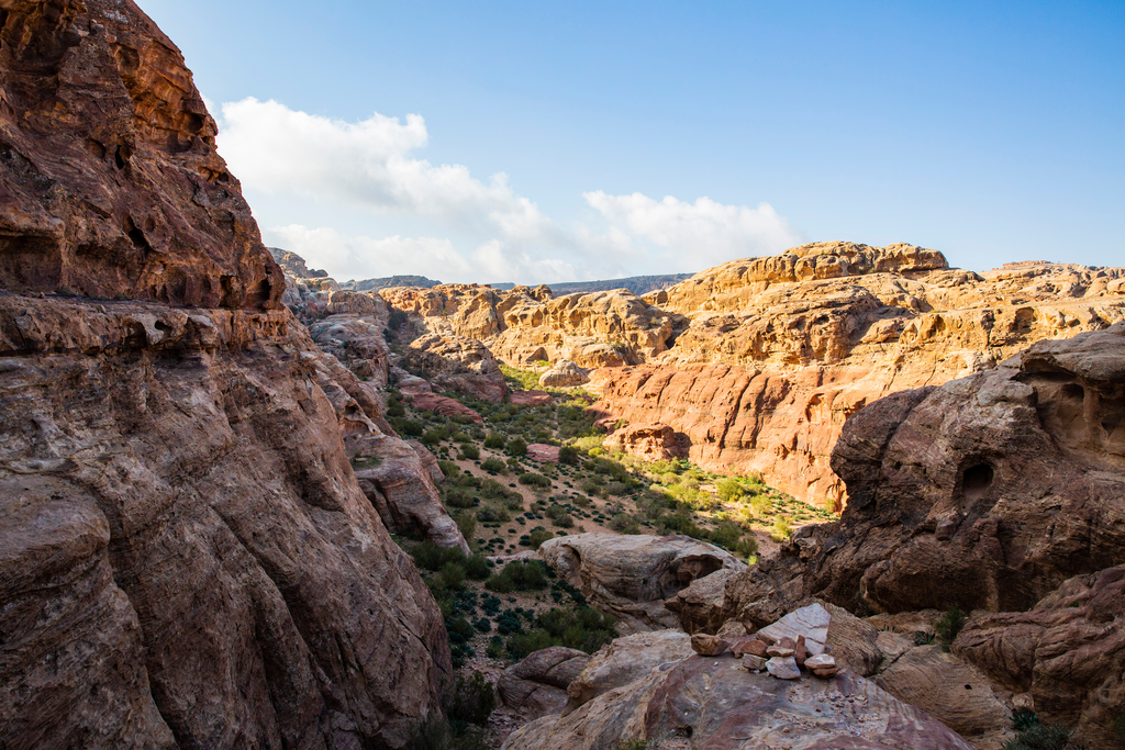<Wir starten unsere heutige Wanderug direkt von unserer Unterkunft aus. Unser Ziel ist die Region "Ras El Feid". Sie ist geprägt von spektakulären Landschaften, die sich durch dramatische Felsformationen, tiefe Schluchten und weite Ebenen auszeichnen. Trotz der scheinbar kargen Wüstenlandschaft gibt es eine erstaunliche Vielfalt an Flora und Fauna, einschließlich Wüstenpflanzen, Eidechsen, Schlangen und gelegentlich Wüstenfüchsen. Unser privater Bus bringt uns in das Beduinencamp nach Little Petra, wo wir die Nacht verbringen werden. Zahlreiche Lichter beleuchten die umliegenden Felsen am Abend.