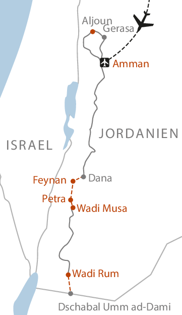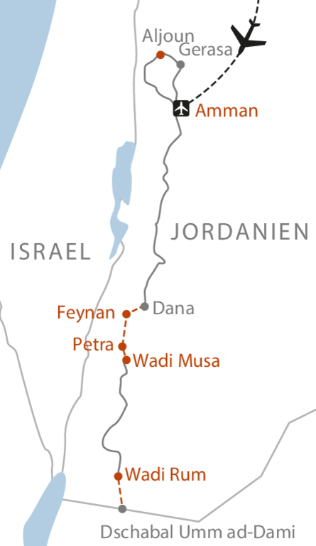 Uns erwartet ein Königreich voller Wunder: Jordanien. Auf unserer Reise entdecken wir die Schätze der Antike und atemberaubende Naturlandschaften. Von den gut erhaltenen römischen Ruinen in Jerash über die majestätische Festung Ajloun bis hin zum vielfältigen Dana Biosphärenreservat – jeder Schritt ist eine Reise durch die Zeit. Im Wadi Rum, einer der schönsten Wüsten der Welt, übernachten wir unter dem funkelnden Sternenhimmel. Gekrönt wird unser Abenteuer durch den Besuch Petras, der in Fels gehauenen Nabatäerstadt und einem UNESCO-Weltkulturerbe von unvergleichlicher Schönheit.
