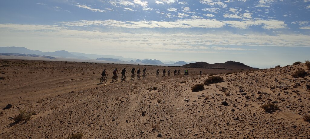<Nach dem Frühstück fahren wir in ca. 40 Minuten aus dem Wadi Musa heraus und folgen dem Königsweg. Ab ca. 1600m schlängelt sich unser Weg in einer angenehmen Abfahrt hinunter zum Dorf Toghra, wo der Asphalt auf die Erde trifft. Je weiter wir nach Süden kommen, desto flacher wird der Weg, je näher wir dem Wadi Rum kommen. Unterwegs halten wir für eine Tasse Tee bei einer einheimischen Beduinenfamilie, um mehr über deren Kultur zu erfahren. Nach einer kurzen Pause setzen wir unsere Radtour nach Wadi Rum über einige sandige Abschnitte und Schlammflächen fort. Nach der Fahrt steigen Sie in den Jeep, der Sie durch die Wüste zu unserem Übernachtungsort bringt.