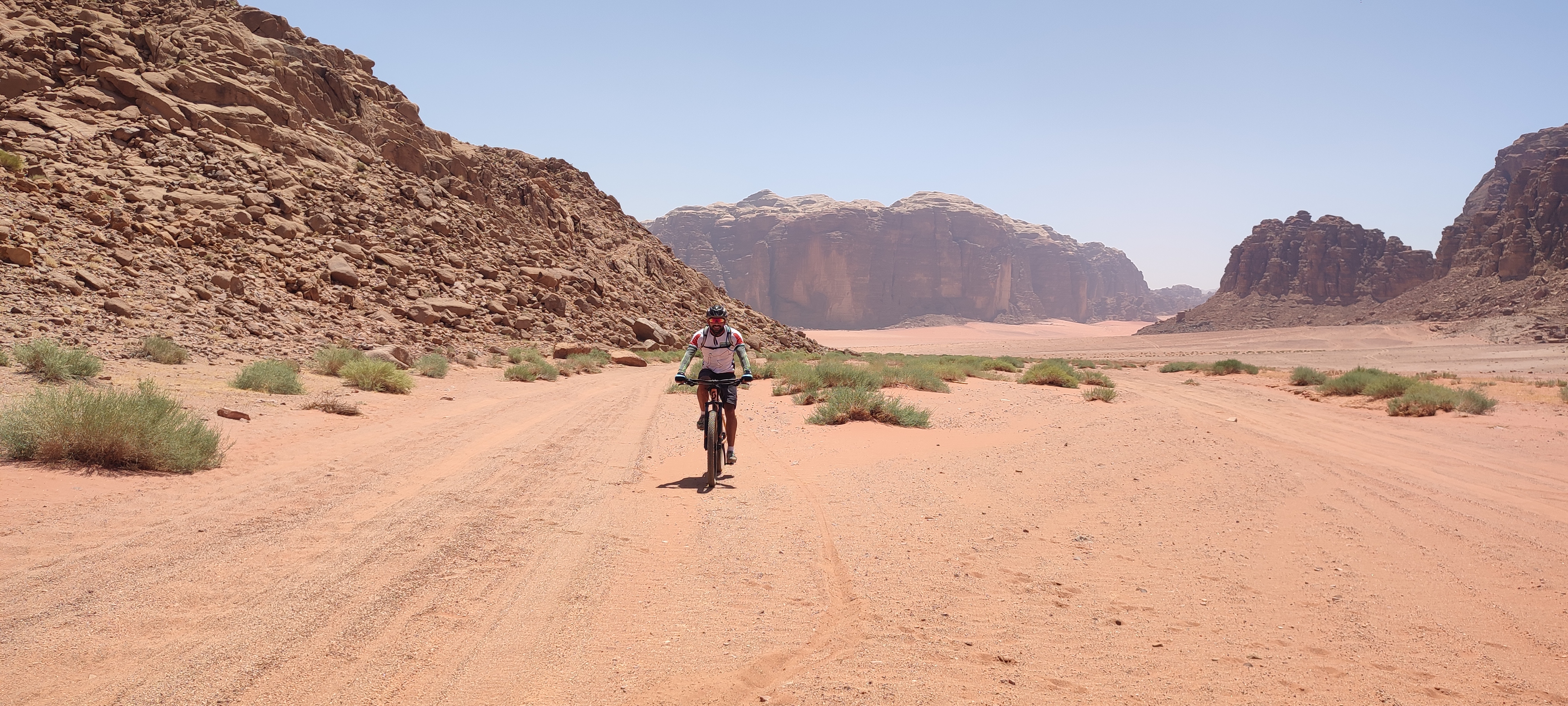 <Nach einem Jeeptransfer von unserem Camp aus werden wir einige Stunden mit dem Fahrrad durch das Wüstenschlammgebiet um Wadi Rum fahren. Später unternehmen Sie eine ca. 4-stündige Jeep-Safari, bei der Sie dieses Weltkulturerbe erkunden und durch die Täler, Canyons, Dünen und Wüsten des Wadi Rum fahren, um Felsinschriften, majestätische Aussichten auf Berge und Landschaften sowie enge Schluchten zu entdecken. Bei jedem Halt haben Sie die Möglichkeit, in Ruhe zu wandern und zu klettern und die Gegend zu erkunden. Sie genießen ein einfaches Mittagessen, das in der Wüste im Schatten der Berge zubereitet wird. Am Abend kehren Sie für eine weitere Nacht zu Ihrem Camp zurück.