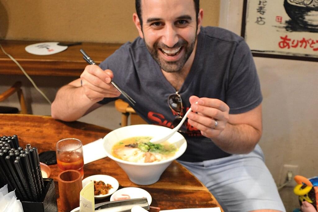 • Schlemme Okonomiyaki - Japans typischer Pfannkuchen mit Ei, Kohl, Soba-Nudeln und Fleisch oder Meeresfrüchten - bei einem Abendessen in Hiroshima in einem speziellen lokalen Restaurant.